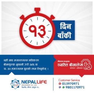नेपाल लाइफको नविकरण बीमाशुल्क भुक्तानीमा ३५ प्रतिशत छुट, अझै १३ दिन बाँकि
