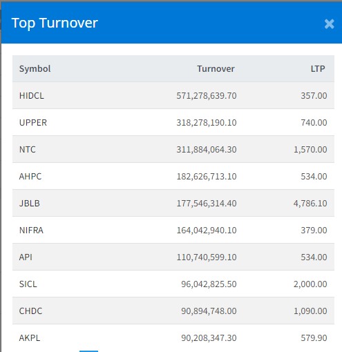 त्यस्तै, अपर तामाकोशीको ३१ करोड ८२ लाख, एनटिसिको ३१ करोड १८ लाख, अरुण भ्याली हाइड्रोपावरको १८ करोड २६ लाख र जीवन विकास लघुवित्तको १७ करोड ७५ लाख भन्दा माथिको कारोबार भएको छ ।