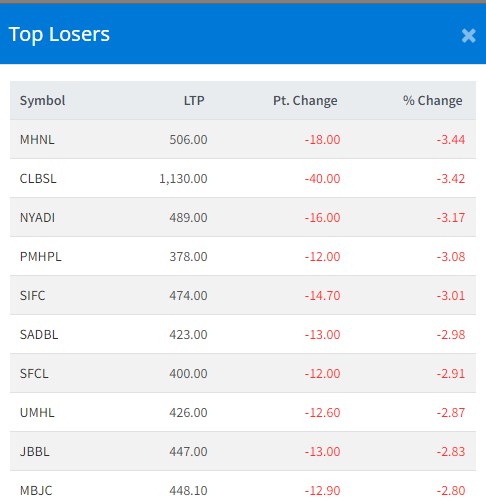 त्यस्तै, सिभिल लघुवित्तको ३.४२ प्रतिशत, न्यादी हाइड्रोपावरको ३.१७ प्रतिशत, पन्चकन्या माई हाइड्रोपावरको ३.०८ प्रतिशत, श्री इन्भेष्टमेन्ट फाइनान्सको ३.०१ प्रतिशत र सांग्रिला डेभलपमेन्ट बैंकको २.९८ प्रतिशतले घटेको हो ।