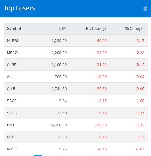 आज नेप्से सुधार आउदा २ कम्पनीको शेयरमा सर्किट लागेको छ भने केही कम्पनीका शेयरधनीले गुमाउन पुगेका छन् । आज सर्वाधिक गुमाउने कम्पनीमा नेरुडे लघुवित्त विकास बैंक रहेको छ । कम्पनीको आज ३.१७ प्रतिशतले घटेको हो ।