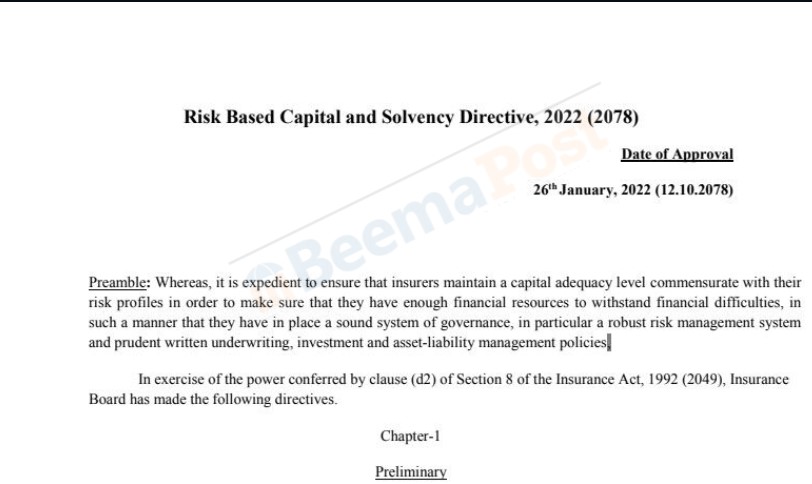 बीमा समितिले निर्देशन जारी गर्दै जोखिममा आधारित पूँजी सम्बन्धी निर्देशिका २०७८ जारी गर्दै साउन २०८० देखि चरणबद्धरुपमा जोखिममा आधारित पूँजी सम्बन्धी निर्देशिका कार्यान्वयनमा ल्याउन निर्देशन दिएको हो ।