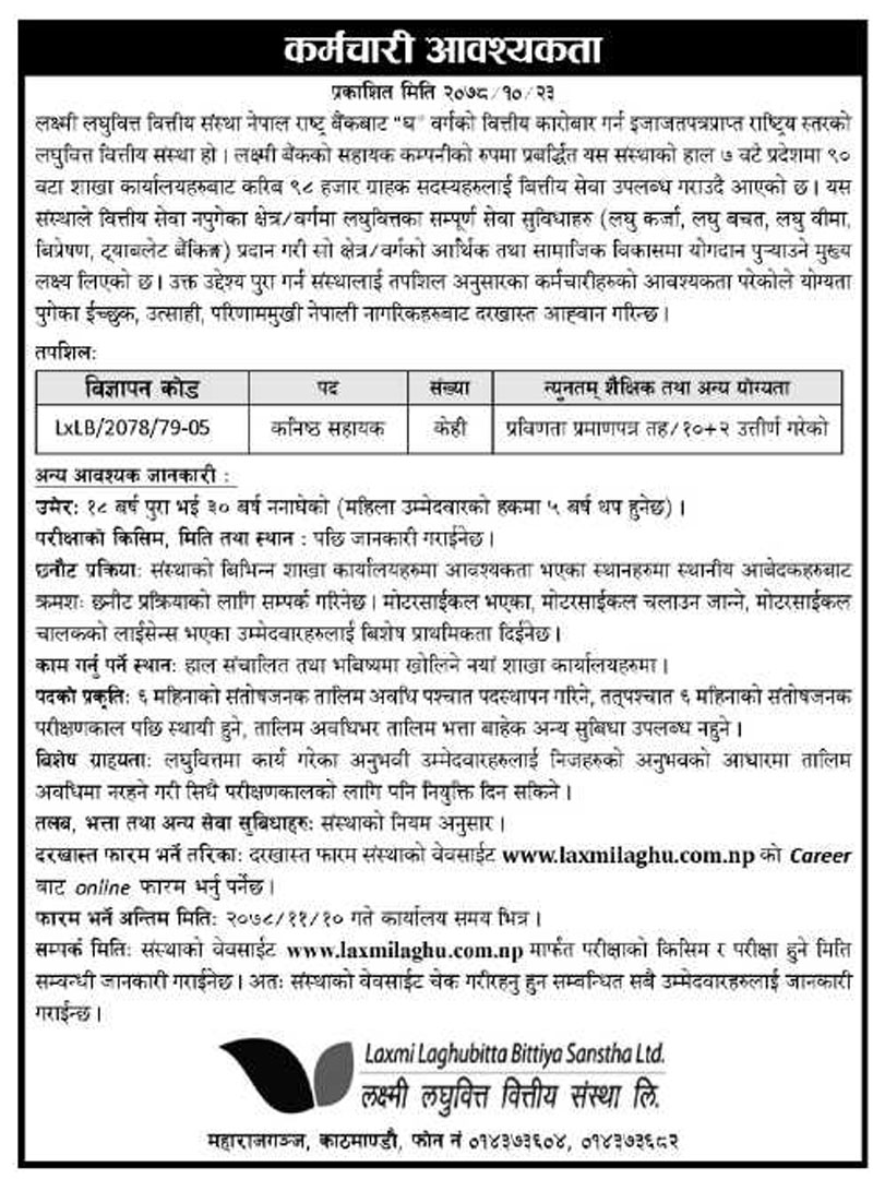 2 thoughts on “प्लस टु उत्तीर्णलाई लक्ष्मी लघुवित्तमा रोजगारीको अवसर
