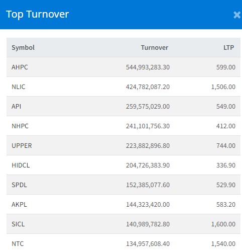 आज नेप्से १.४४ प्रतिशतले घट्दा कारोबार समेत खुम्चिन पुगेको छ । ५ अर्बमाथिको कारोबार हुँदा सर्वाधिक अरुण भ्याली हाइड्रोपावरको भएको छ । कम्पनीको आज एकैदिन ५४ करोड ४९ लाख ९३ हजार २८३ रुपैयाँको कारोबार भएको छ ।