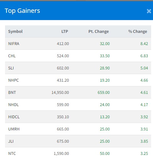 त्यस्तै, छाङ्दी हाईड्रोपावरको ६.८३ प्रतिशत, सानिमा लाइफ इन्स्योरेन्सको ५.०४ प्रतिशत, नेशनल हाइड्रो पावरको ४.६६ प्रतिशत, बोट्लस नेपालको ४.६१ प्रतिशत र नेपाल हाइड्रो डेभलोपेरको ४.१७ प्रतिशतले वृद्धि भएको हो ।