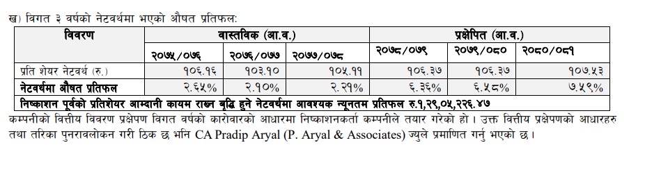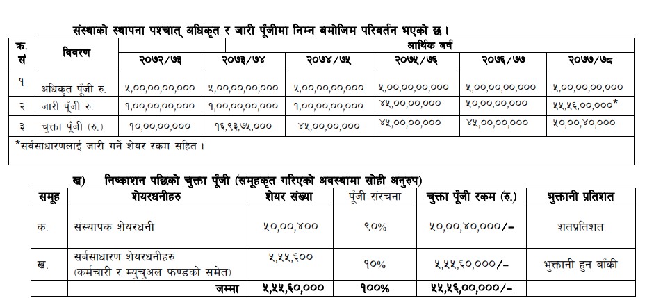 यस निष्काशन मार्फत रु.५,५५,६०,०००/– (रु.पाँच करोड पचपन्न लाख साठी हजार) सर्बसाधारणहरुलाई बाँडफाँड पश्चात कम्पनीको चुक्ता पूँजी रु. ५५,५६,००,०००/– (रु. पचपन्न करोड छपन्न लाख) हुने छ ।