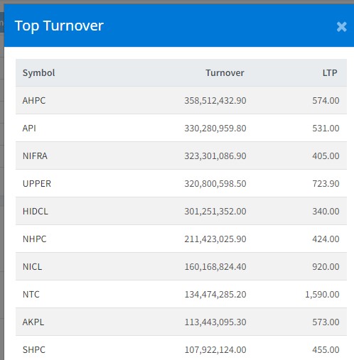 त्यस्तै, अपि पावरको ३३ करोड २ लाख, निफ्राको ३२ करोड ३३ लाख, अपर तामाकोशीको ३२ करोड ८ लाख र एचआइडिसिएलको ३० करोड १२ लाख माथिको कारोबार भएको छ ।