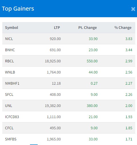 त्यस्तै, बुद्धभुमि नेपाल हाइड्रोपावरको ३.४४ प्रतिशत, राष्ट्रिय बीमा कम्पनीको २.९९ प्रतिशत, विन नेपाल लघुवित्तको २.५६ प्रतिशत, एनएमबि हाईब्रिड फण्डको २.२७ प्रतिशत र समृद्धि फाइनान्सको २.२६ प्रतिशतले वृद्धि भएको हो ।