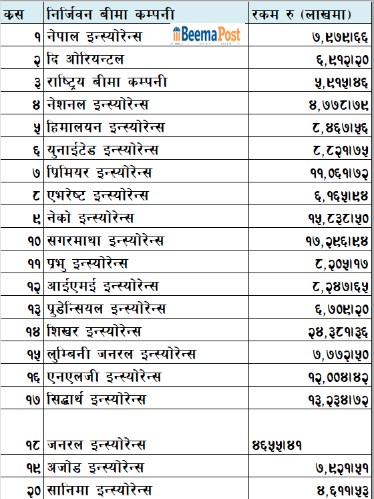 त्यस्तै, ओरिएण्टल इन्स्योरेन्सले ६९ करोड १२ लाख रुपैयाँ, प्रुडेन्सियल इन्स्योरेन्सले ६७ करोड ९ लाख रुपैयाँ, एभरेष्ट इन्स्योरेन्सले ६१ करोड ६५ लाख रुपैयाँ, राष्ट्रिय बीमा कम्पनीले ५९ करोड १५ लाख, नेशनल इन्स्योरेन्सले ४७ करोड ७८ लाख रुपैयाँ, जनरल इन्स्योरेन्सले ४६ करोड ५५ लाख रुपैयाँ र सानिमा जनरलले ४६ करोड ११ लाख रुपैयाँ बीमाशुल्क आर्जन गर्न सफल भएको छ।