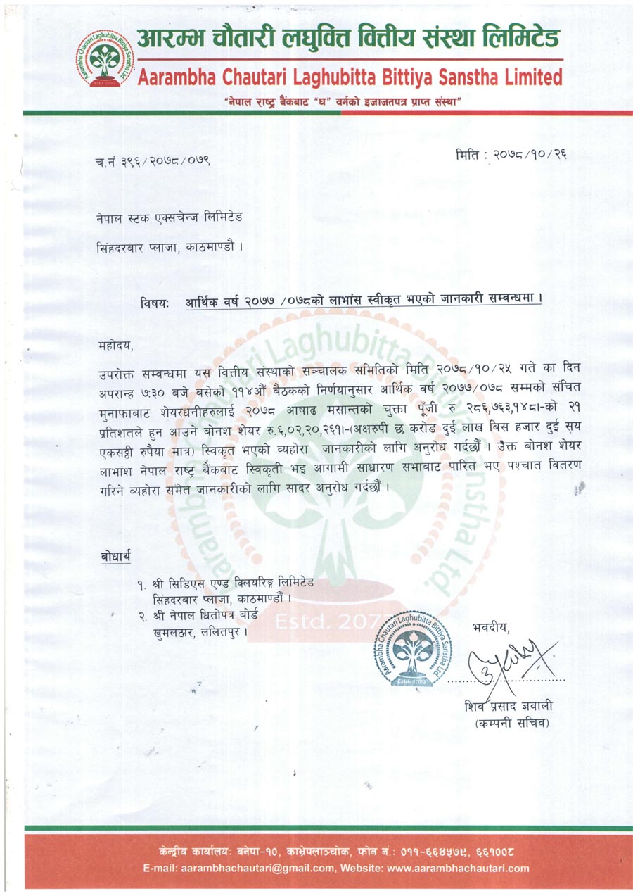 आरम्भ चौतारी लघुवित्तद्धारा लाभांश घोषणा, कति दिदैछ बोनस ?
