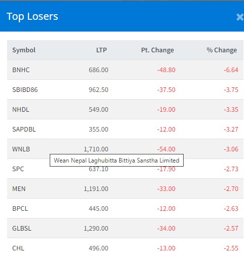 त्यस्तै, नेपाल एसबिआइ बैंक डिबेञ्चरको ३.७५ प्रतिशत, नेपाल हाइड्रो डेभलोपेरको ३.३५ प्रतिशत, सप्तकोशी डेभलपमेन्टको ३.२७ प्रतिशत, विन नेपाल लघुवित्तको ३.०६ प्रतिशत र समलिङ पावरको २.७३ प्रतिशतले घटेको हो ।