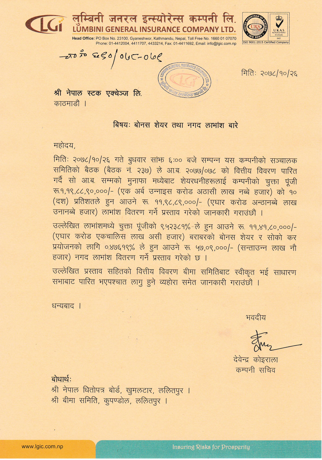 उक्त प्रस्तावित लाभांश बीमा समितिबाट स्विकृत भई कम्पनीको आगामी साधारण सभाबाट पारित भएपश्चात मात्र शेयरधनीहरुलाई वितरण गरिने कम्पनीले जनाएको छ ।