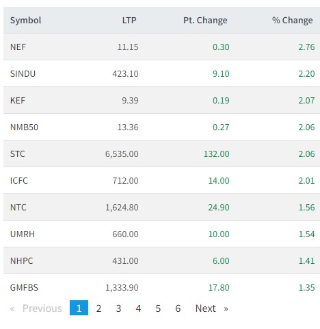 त्यस्तै, सिन्धु विकास बैंकको २.२० प्रतिशत, कुमारी इक्वाटी फण्डको २.०७ प्रतिशत, एनएमबि फिप्टीको २.०६ प्रतिशत, साल्ट टे«स कर्पोरेटको २.०६ प्रतिशत र आइसिएफसि फाइनान्सको २.०१ प्रतिशतले वृद्धि भएको हो ।