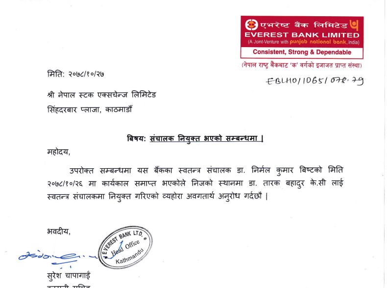 काठमाडौं । एभरेष्ट बैंक लिमिटेडले संचालकमा डा. तारक बहादुर के.सी लाई स्वतन्त्र संचालक नियुक्त गरेको छ ।