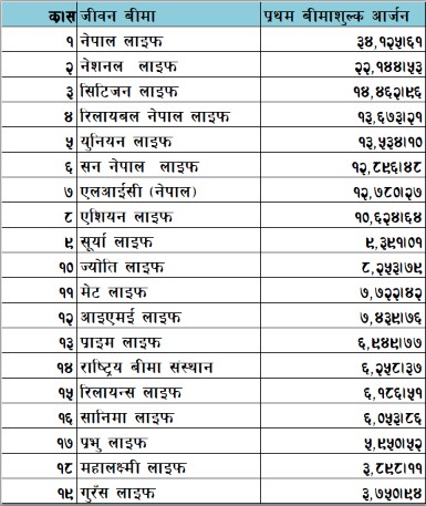 जीवन बीमा कम्पनीहरुमध्ये दोस्रो त्रैमाससम्ममा सबैभन्दा धेरै प्रथम बीमाशुल्क आर्जन गर्न सफल नेपाल लाइफ इन्स्योरेन्स कम्पनी रहेको छ । कम्पनीले यस अवधिसम्ममा ३ अर्ब ४१ करोड रुपैयाँ कुल बीमाशुल्क आर्जन गर्न सफल भएको छ।