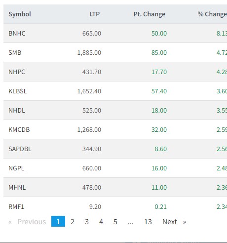 त्यस्तै, सपोर्ट माइक्रोफाइनान्सको ४.७२ प्रतिशत, नेशनल हाइड्रोपावरको ४.२८ प्रतिशत, किसान लघुवित्तको ३.६० प्रतिशत, नेपाल हाइड्रो डेभलोपरको ३.५५ प्रतिशत, कालिका लघुवित्तको २.५९ प्रतिशत, सप्तकोशी डेभलपमेण्टको २.५६ प्रतिशत, ङादी गु्रप पावरको २.४८ प्रतिशत र माउटेन हाइड्रो नेपालको २.३६ प्रतिशतले बढेको हो ।
