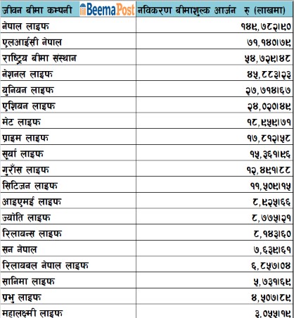 त्यस्तै, सिटिजन लाइफले १ अर्ब १५ करोड रुपैयाँ, आइएमई लाइफले ८९ करोड रुपैयाँ, ज्योति लाइफले ८७ करोड, रिलायन्स लाइफले ८१ करोड रुपैयाँ, सन नेपाल लाइफले ७६ करोड, रिलायबल नेपाल लाइफले ६८ करोड रुपैयाँ, सानिमा लाइफले ५७ करोड रुपैयाँ, प्रभु लाइफले ४५ करोड रुपैयाँ र सबैभन्दा कान्छो महालक्ष्मी लाइफले ३० करोड रुपैयाँ नविकरण बीमाशुल्क आर्जन गर्न सफलभएका छन् ।