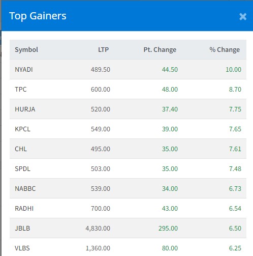 त्यस्तै, तेह्रथुम पावरको ८.७० प्रतिशत, हिमालयन उर्जा विकासको ७.७५ प्रतिशत, कालिका पावरको ७.६५ प्रतिशत, छाङदी हाइड्रोपावरको ७.६१ प्रतिशत, सिर्नजी पावरको ७.४८ प्रतिशत र नारायणी डेभलपमेण्ट बैंकको ६.७३ प्रतिशतले बढेको हो ।