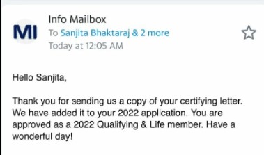 अन्तराष्ट्रिय स्तरको हेर्ने हो भने एमडिआरटीमा आजिवन जस्तो सफलता हात पार्ने अभिकर्ताहरु धेरै भएपनि नेपालबाट भने संजिता भक्त राजले पहिलोपटक उक्त उपब्धि पारेकी हुन् । नेपालबाट आगामी बर्ष एलआईसी नेपालबाट नै दुई जनाले मिलियन राउण्ड टेवल (एमडिआरटी) को आजिवन सदस्य बन्न पाउनेछन् ।