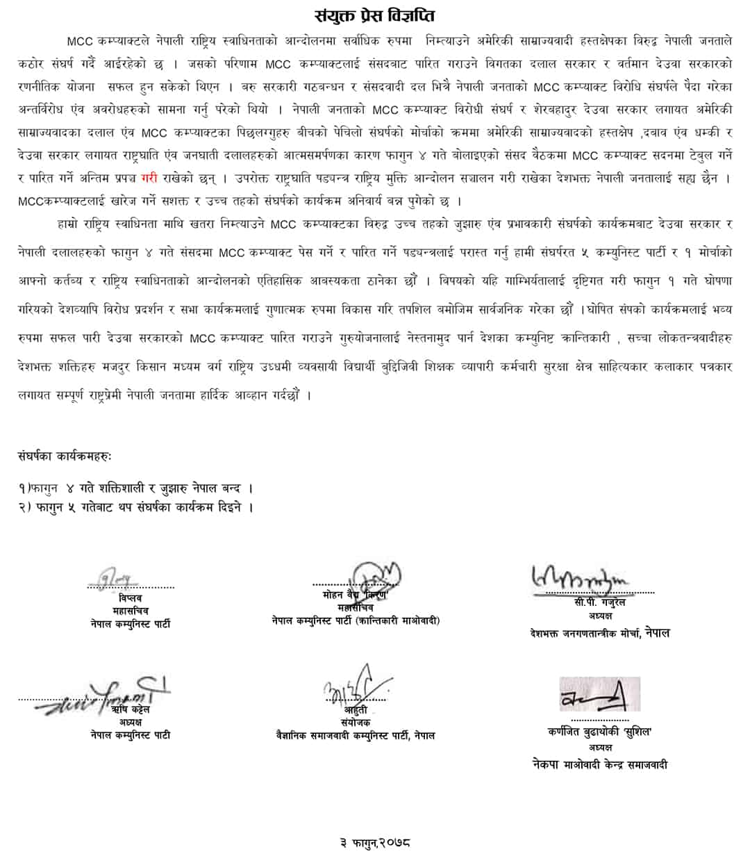 काठमाडौं । सरकारले अमेरिकी सहयोग परियोजना एमसीसी संसदमा टेबुल गर्ने निर्णय गरेको विरोधमा नेपालका पाँच वामपन्थी पार्टीहरुले भोलि फागुन ४ गते नेपाल बन्दको घोषणा गरेका छन् । अमेरिकी सहयोग परियोजना एमसीसी भोलि संसदमा टेबुल गर्न प्रधानमन्त्री शेर बहादुर देउवाले बलजफ्ती गरेपछि पाँच वटा पार्टी तथा एउटा मोर्चाले देशव्यापी नेपाल बन्दको घोषणा गरेको हो । आज बसेको पाँच वटै पार्टी र मोर्चाको संयुक्त बैठकले भोलि नेपाल बन्दको निर्णय गरेको हो । संयुक्त बैठकको बक्तव्य केहीबेरमा जारी हुनेछ ।