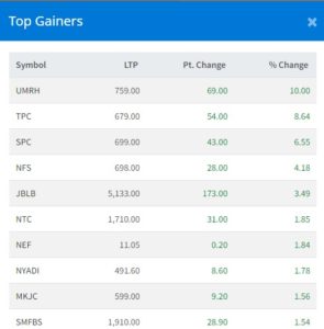 त्यस्तै, तेह्रथुम पावरको ८.६४ प्रतिशत, समलिङ पावरको ६.५५ प्रतिशत, नेपाल फाइनान्सको ४.१८ प्रतिशत, जीवन विकास लघुवित्तको ३.४९ प्रतिशत, नेपाल दुरसञ्जाल कम्पनीको १.८५ प्रतिशत र नबिल इक्वाटी फण्डको १.८४ प्रतिशतले वृद्धि भएको हो ।