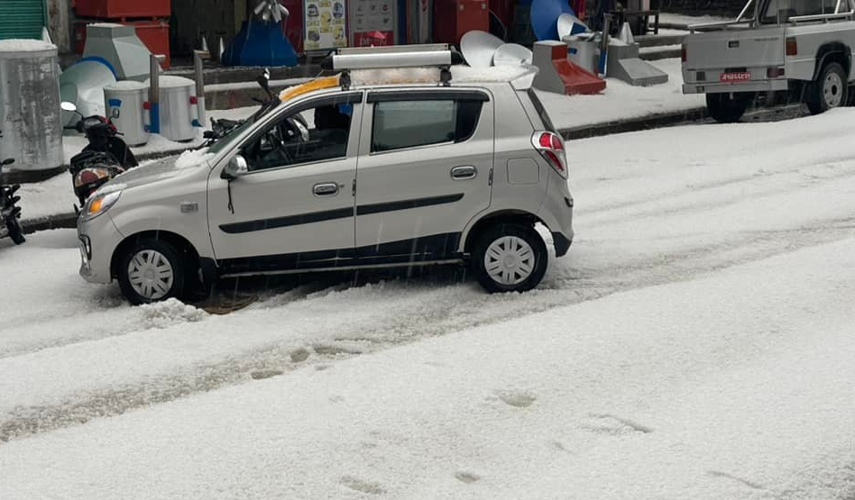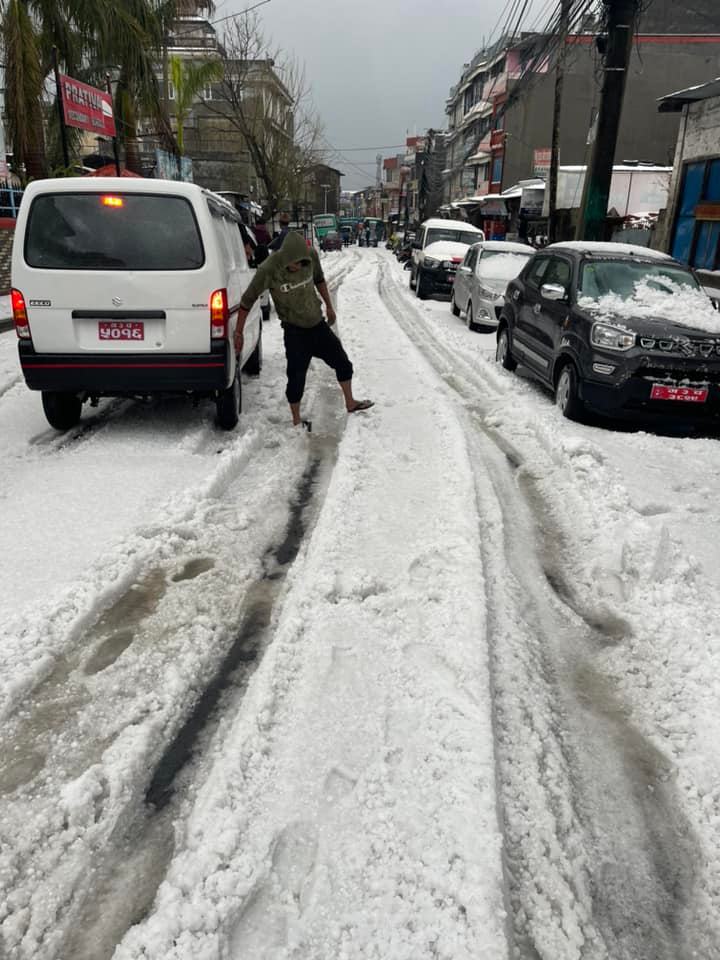 पोखरामा भिषण असिनाको बर्षा, सडकमै तीन फिट माथिसम्म जम्यो असिना, यातायात अबरुद्ध