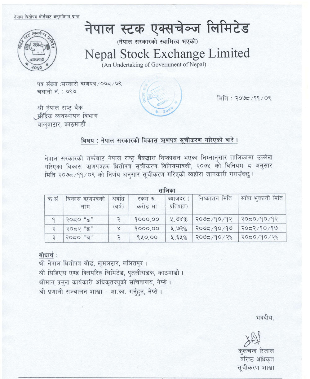बैंकका तर्फबाट माघ १२ गते निष्काशन भएको ५.७४ प्रतिशत ब्याजदर रहेको २ वर्षे अवधिको ‘२०८० ङ’ नामक १० अर्ब रकमको विकास ऋणपत्र, माघ १७ मा निष्काशन भएको ४ वर्षे अवधिको ५.७२ प्रतिशत ब्याजदर रहेको ‘२०८२ ‘ङ’ नामक १० अर्ब रकम बराबरको विकास ऋणपत्र र माघ २६ गते निष्काशन भएको ‘२०८० ‘च’ नामक २ वर्षे अवधिको ५.६५ प्रतिशत ब्याजदर रहेको ९ अर्ब ५० करोड रकमको विकास ऋणपत्र आज सूचीकृत भएको हो ।