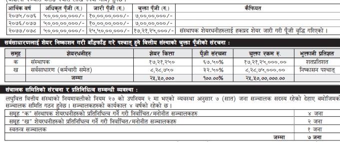 जारी पूँजी : वित्तीय संस्थाको जारी पूँजी रु.२५,५०,००,०००/ (अक्षरेपी पचीस करोड पचास लाख मात्र) रहेको छ । सो पूँजीलाई रु.१००÷ का दरले २५,५०,००० (पचीस लाख पचास हजार) थान साधारण शेयरमा विभाजित गरिएको छ ।