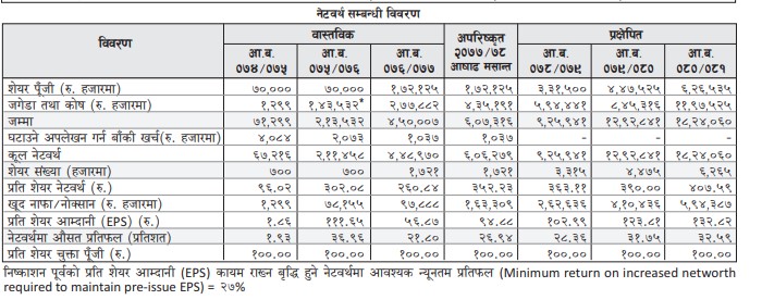 संस्थाले आर्थिक वर्ष २०८०र८१ मा खुद नाफा ५९ करोड ४३ लाख रुपैयाँ हुने अनुमान गरिएको छ। चालु आवमा कम्पनीको नाफा २६ करोड २६ लाख रुपैयाँ र आउँदो आवमा ४१ करोड ४ लाख रुपैयाँ हुने प्रक्षेपण गरिएको छ।