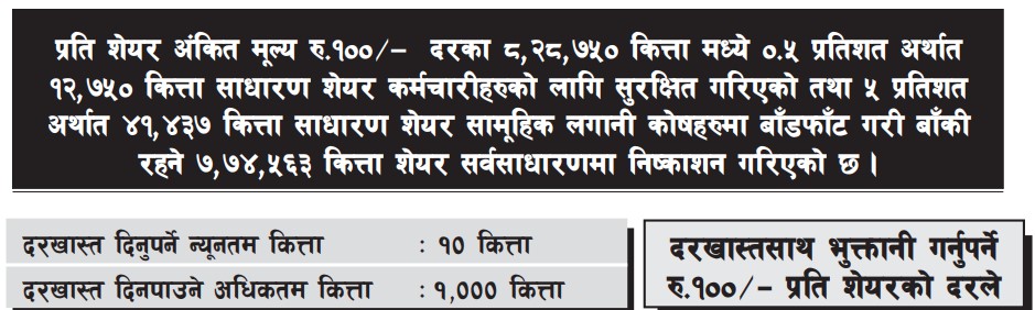 संस्थाले कुल कित्तामध्ये ०.५ प्रतिशतले हुन आउने १२ हजार ७५० कित्ता कर्मचारीका लागि सुरक्षित गरेको छ भने ५ प्रतिशतले हुन आउने ४१ हजार ४३७ कित्ता सामूहिक लगानी कोषका लागि बाँडफाँड गर्नेछ। बाँकी ७ लाख ७४ हजार ५६३ कित्तामा सर्वसाधारणले आवेदन दिन पाउनेछन्।
