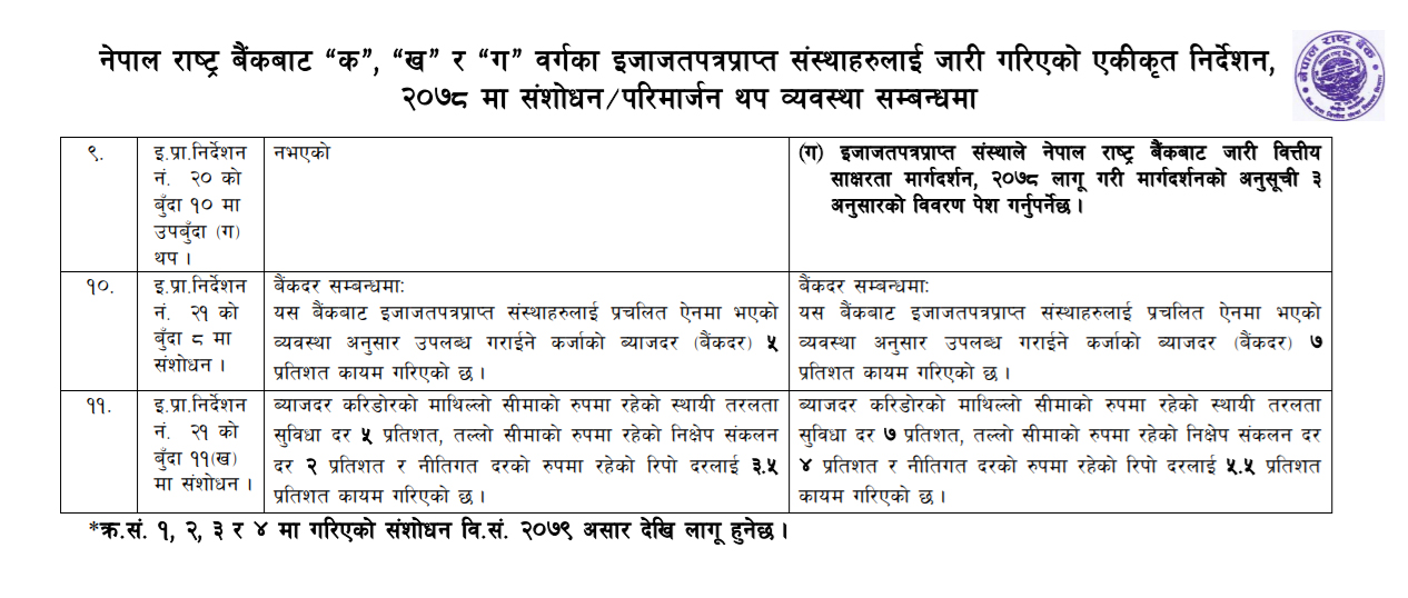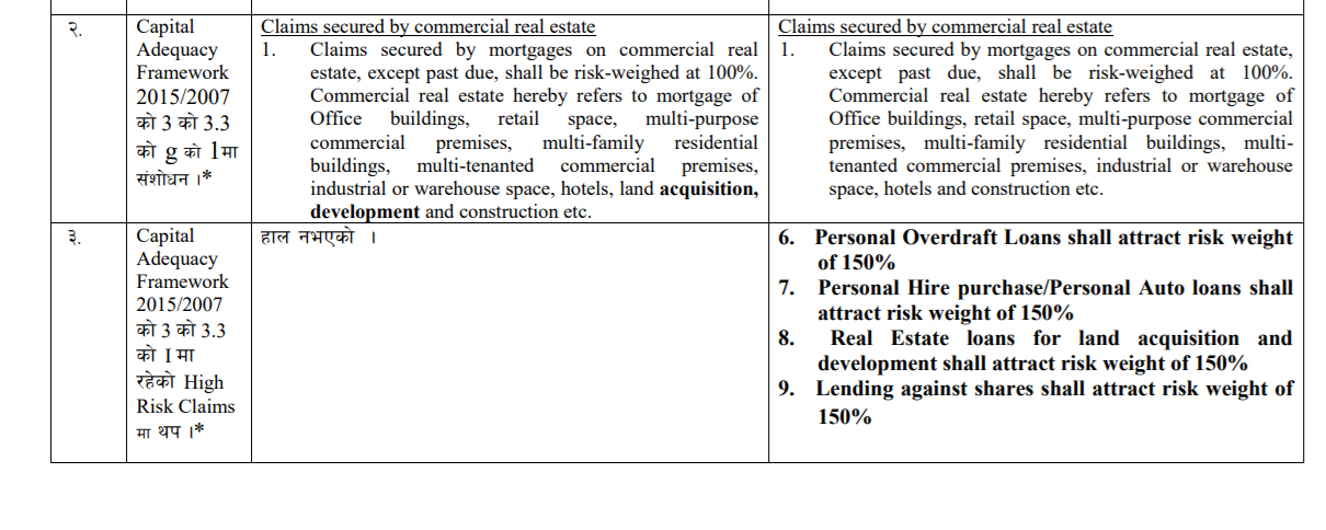 केन्द्रीय बैंकले जारी गरेको चालु आवको मौद्रिक नीतिको अर्धबार्षिक समीक्षा सार्वजनिक गर्दै घरजग्गा र शेयर धितो तथा व्यक्तिगत ओभरड्राफ्ट कर्जामा कडाई गरेको थियो । तर, राष्ट्र बैंकले आज जारी गरेको निर्देशनमा शेयरधितो, घरजग्गा तथा व्यक्तिगत ओभरड्राफ्ट कर्जा सम्बन्धी नियम आगामी आर्थिक वर्षदेखि मात्रै लागू गर्ने निर्णय भएको छ । यद्यपि शेयर कर्जा, घरजग्ग र व्यक्तिगत कर्जाको जोखिममा आधारित पुँजिकोषको भार गणना गर्दा त्यस्तो प्रतिशत बृद्धि गरिएको कारण बैंकहरु कर्जा दिन स्वतन्त्र भएपनि कर्जा दिन पुँजिकोषको समस्या पर्ने भएको छ ।
