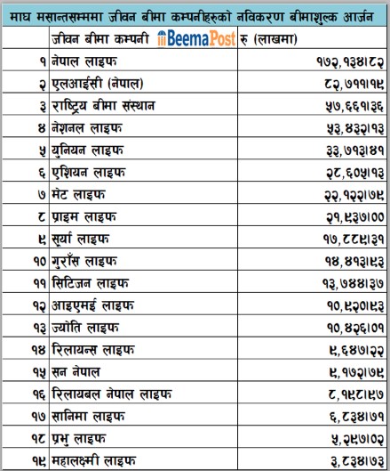 बीमा समितिको तथ्याङ्क अनुसार नेशनल लाइफ इन्स्योरेन्स कम्पनीले यस अवधिसम्मा ५ अर्ब ३४ करोड रुपैयाँ, युनियन लाइफले ३ अर्ब ३७ लाख रुपैयाँ, एशियन लाइफले २ अर्ब ८६ करोड रुपैयाँ, मेट लाइफले २ अर्ब २१ करोड रुपैयाँ, प्राइम लाइफले २ अर्ब १९ करोड रुपैयाँ, सूर्या लाइफले १ अर्ब ७८ करोड रुपैयाँ, गुराँस लाइफले १ अर्ब ४४ करोड रुपैयाँ, सिटिजन लाइफले १ अर्ब ३७ करोड रुपैयाँ, आइएमई लाइफले १ अर्ब ९ करोड रुपैयाँ र ज्योति लाइफले १ अर्ब ४ करोड रुपैयाँ नविकरण बीमाशुल्क आर्जन गर्न सफल भएका छन् ।