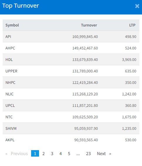 त्यस्तै, अरुण भ्याली, हिमालयन डिष्टीलरी, अपर तामाकोशी, नेशनल हाईड्रोपावर, नेपाल लाइफ, युनिभर्सल पावर, नेपाल टेलिकम, शिव्म सिमेन्ट्स, अरुण काबेलीको सर्वाधिक कारोबार भएको छ ।