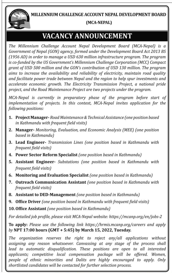 एमसिएले प्रोजेक्ट म्यानेजरदेखी अफिस एसिटेन्ससम्मका पदका लागि कर्मचारी मागेको छ । योग्यता पुगेका इच्छुक ब्यक्तिले चैत १ गते भित्र आवश्यक कागजात संकलन गरी एमसिएको बेवसाइट मार्फत आवेदन दिन सक्नेछन् ।