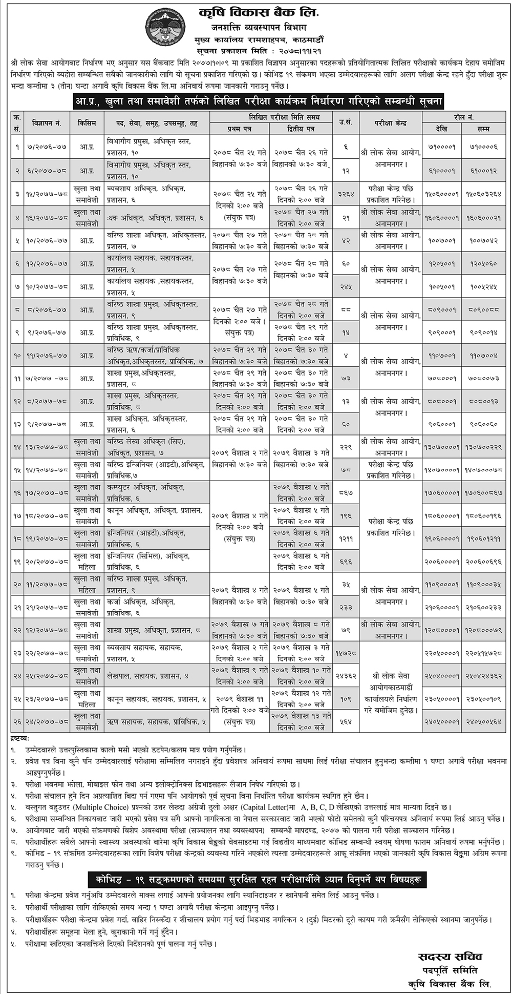 काठमाडौं । कृषि विकास बैंक लिमिटेडले आन्तरिक प्रतियोगितात्मक, खुल्ला तथा समावेशी तर्फको लिखित परीक्षा कार्यक्रम निर्धारण गरेको छ ।