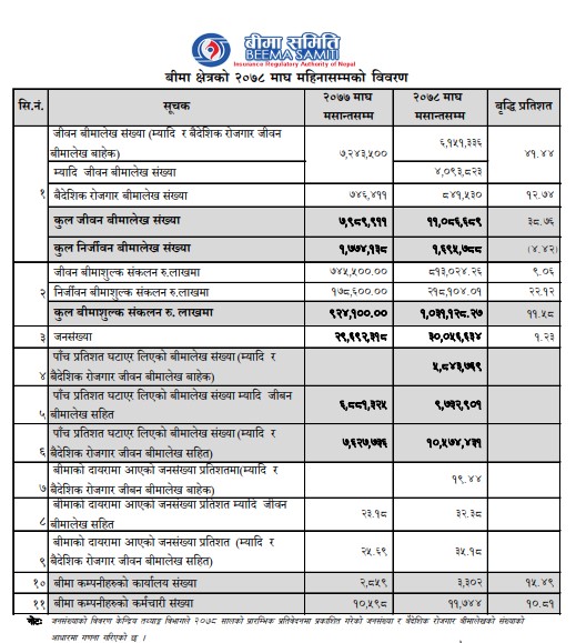 चालु आवको माघ महिनासम्ममा नेपालको कुल जनसंख्या तीन करोड ५६ लाख ६३४ जना छ । जसमा एक करोड ५ लाख ७४ हजार ४३१ वटा बीमालेख बिक्री भएको समितिको तथ्यांक छ । कम्पनीहरुमा कुल एक करोड १० लाख ८६ हजार ६८९ बीमालेख जारी भएका छन् ।