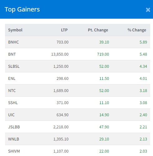 त्यस्तै, बोटलर्स नेपालको ५.४८ प्रतिशत, समुदायिक लघुवित्तको ४.३४ प्रतिशत, इर्मजिङ नेपालको ४.०१ प्रतिशत, नेपाल दुरसञ्चार कम्पनीको ३.१८ प्रतिशत, शिव श्री हाइड्रोपावरको ३.०८ प्रतिशत, यूनाइटेड इन्स्योरेन्सको २.४० प्रतिशत र जनउत्थान सामुदायिक लघुवित्तको २.२१ प्रतिशतले बढेको हो ।
