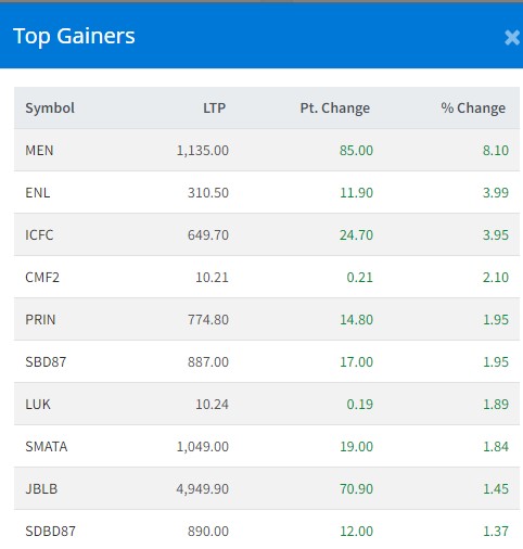 त्यस्तै, इमर्जिङ नेपाल लिमिटेडको ३.९९ प्रतिशत, आइसिएफसि फाइनान्सको ३.९५ प्रतिशत, सिटिजन्स म्युचुअल फण्डको २.१० प्रतिशत र प्रभु इन्स्योरेन्सको १.९५ प्रतिशतले बढेको छ ।