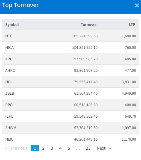 त्यस्तै, एनआईसी एशिया बैंक, अपी पावर, अरुण भ्याली, हिमालयन डिष्टीलरी, जीवन विकास लघुवित्त, पाँच्थर पावर, आइसीएफसी फाइनान्स, शिवम् सिमेन्ट्स र नेपाल लाइफको सर्वाधिक कारोबार भएको छ।