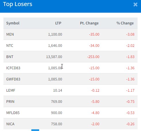 त्यस्तै, नेपाल दुरसंञ्चार कम्पनीको २.०२ प्रतिशत, बोटलर्स नेपालको १.८३ प्रतिशत, आइसिएफसी फाइनान्स डिबेञ्चरको १.३६ प्रतिशत, गुडविल फाइनान्स डिबेञ्चरको १.३६ प्रतिशत र लक्ष्मी इक्विटी फण्डको १.१७ प्रतिशतले घटेको हो ।