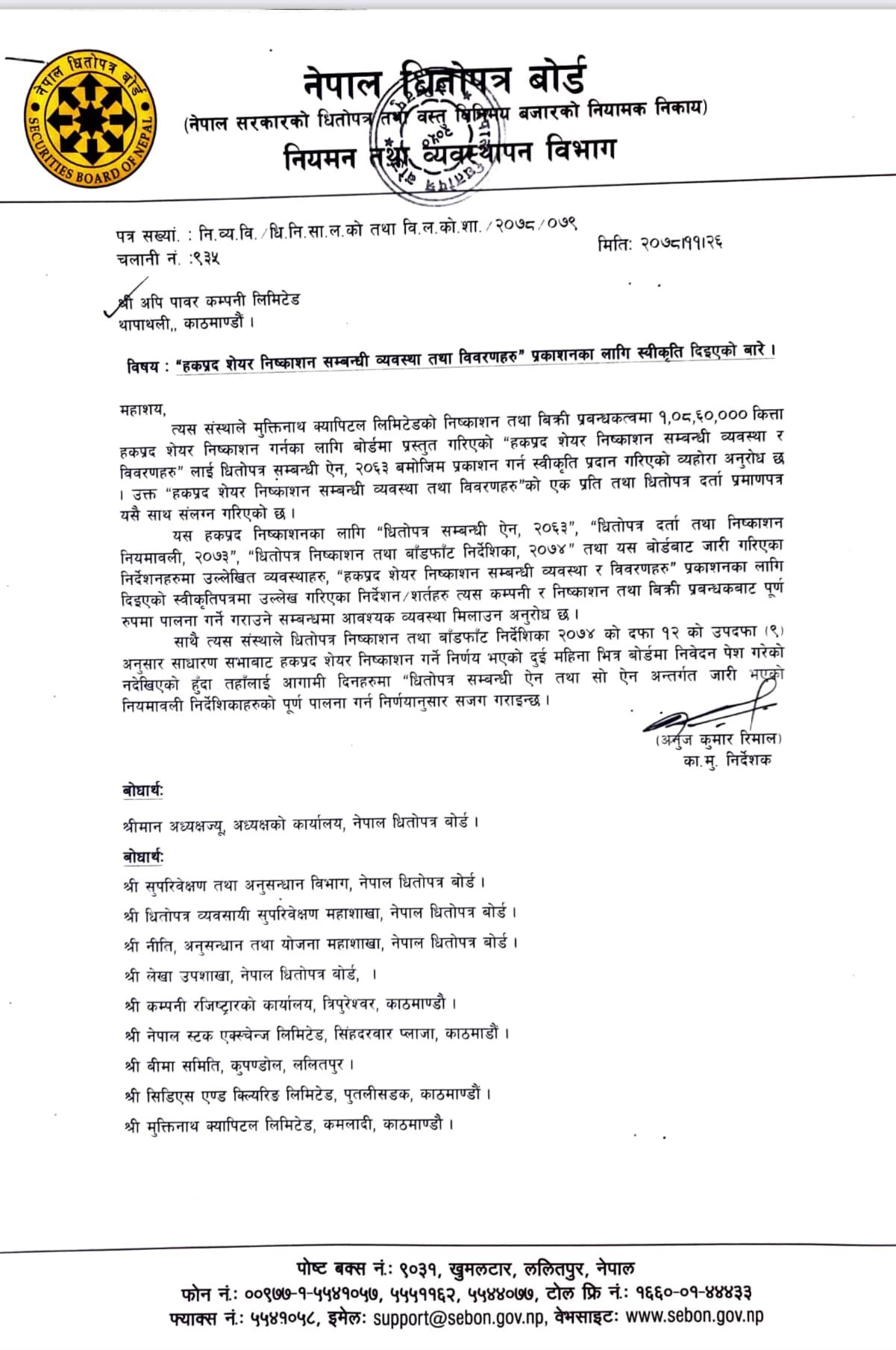 काठमाडौं । अपि पावर कम्पनी लिमिटेडले हकप्रद शेयर निष्कासनका लागि नेपाल धितोपत्र बोर्ड (सेबोन) बाट अनुमति पाएको छ ।