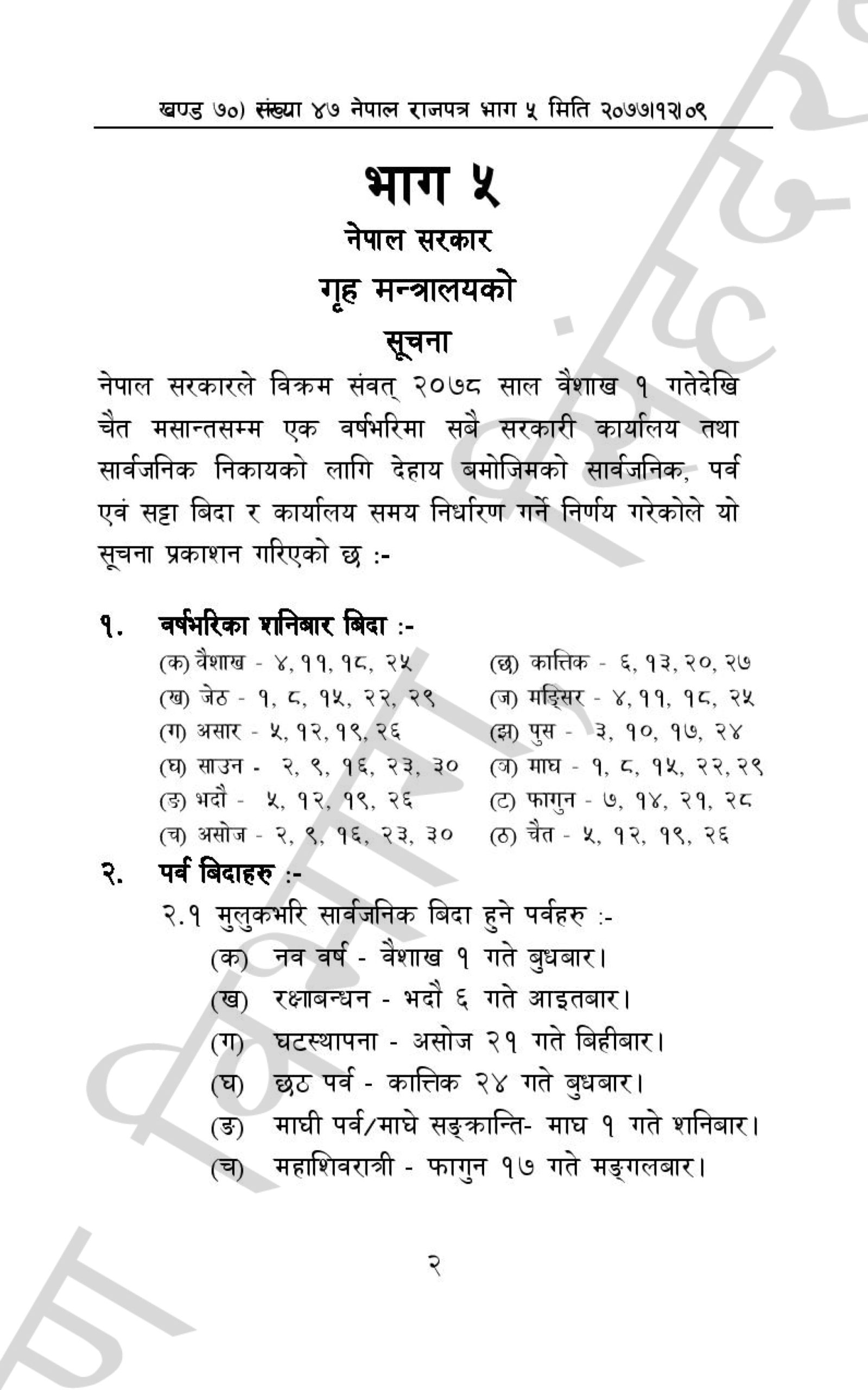 बिहीबार मन्त्रालयले राजपत्र उक्त सूचना प्रकाशित गर्दै वैशाख १ गतेदेखि चैत मसान्तसम्म मुलुकभरिका सबै सरकारी कार्यालय तथा सार्वजनिक निकायका लागि हुने बिदाको सूची राखेको हो।वर्ष २०७९ मा ५२ दिन शनिबार र ४३ दिन अन्य बिदा गरि ९५ दिन सार्वजनिक बिदा हुनेछ।