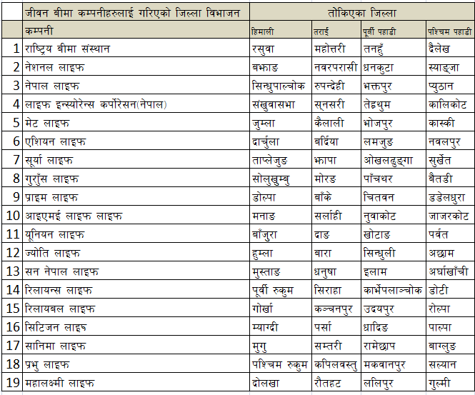 जीवन बीमा कम्पनीहरुले साक्षरता कार्यक्रम संचालन गर्नैपर्ने, कुन जिल्ला कसको भागमा (सूचिसहित)