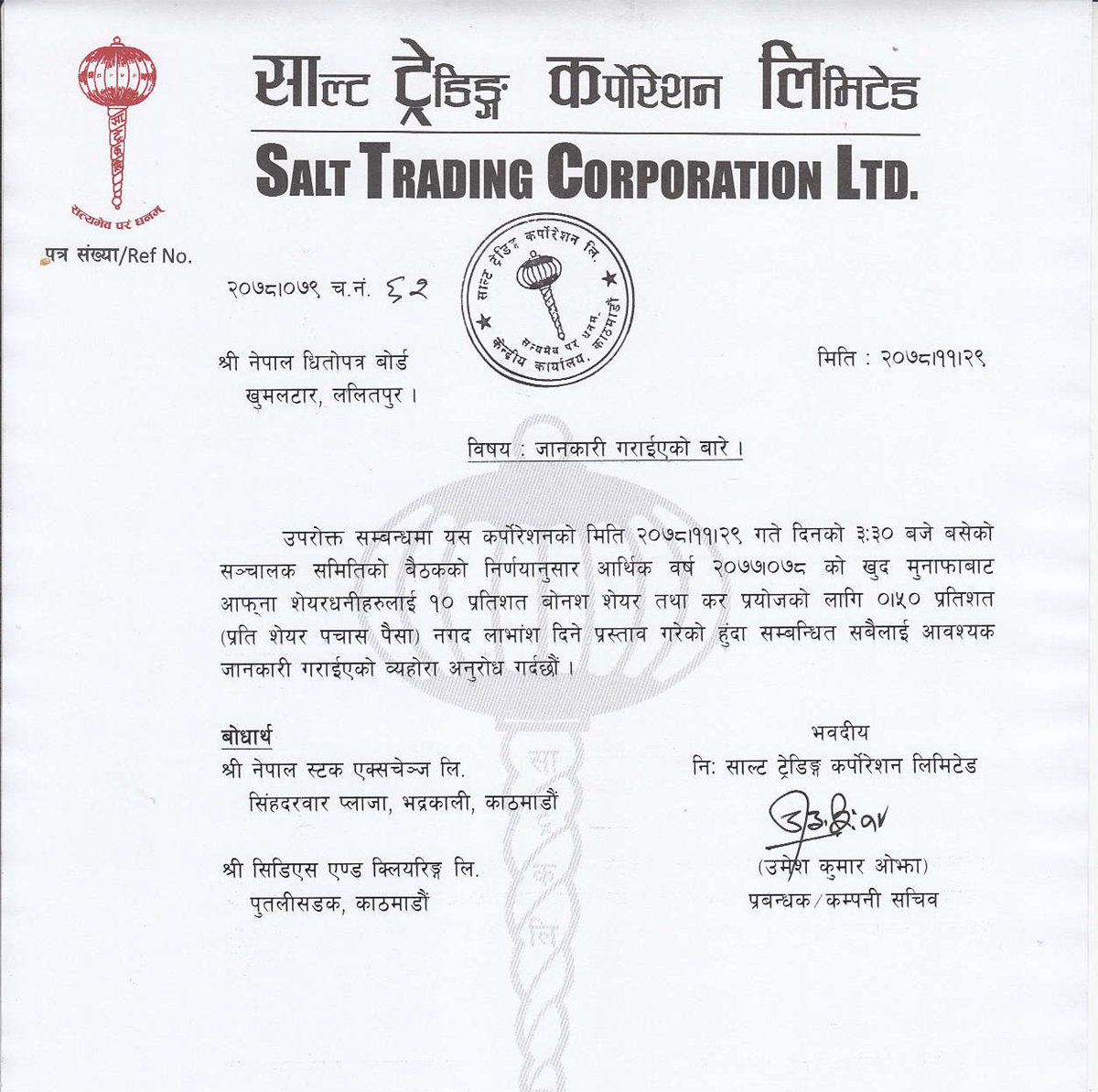 काठमाडौं । साल्ट ट्रेडिङ कर्पोरेशन लिमिटेडले लाभांश घोषणा गरेको छ । कम्पनीले गत आर्थिक वर्षको मुनाफाबाट आफ्ना शेयरधनीहरुलाई लाभांश वितरण प्रस्ताव गरेको हो ।