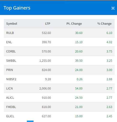 त्यस्तै, इर्मजिङ नेपालको ४.०२ प्रतिशत, कर्पोरेट डेभलपमेन्ट बैंकको ३.७५ प्रतिशत, स्वाबलम्बन लघुवित्तको ३.२५ प्रतिशत, प्रभु इन्स्योरेन्सको ३ प्रतिशत, एनआईबिएल समृद्धि फण्डको २.८८ प्रतिशत, लाइफ इन्स्योरेन्सको २.७७ प्रतिशत र एशियन लाइफ इन्स्योरेन्सको २.७७ प्रतिशतले वृद्धि भएको हो ।