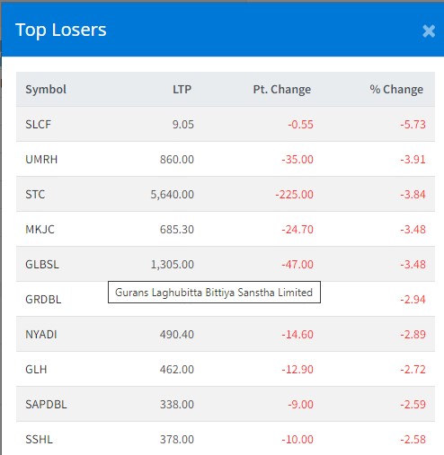 सोमबार गुमाउने कम्पनीमा युनाइटेड इदि मार्दी आरबि हाइड्रोपावरको ३.९१ प्रतिशत, साल्ट टे«डिङ कर्पोरेशनको ३.८४ प्रतिशत, मैलुङ खोला जलविद्युतको ३.४८ प्रतिशत, गुराँस लघुवित्तको ३.४८ प्रतिशत, ग्रीन डेभलपमेन्ट बैंकको २.९४ प्रतिशत र न्यादी हाइड्रोपावरको २.८९ प्रतिशतले घटेको हो ।