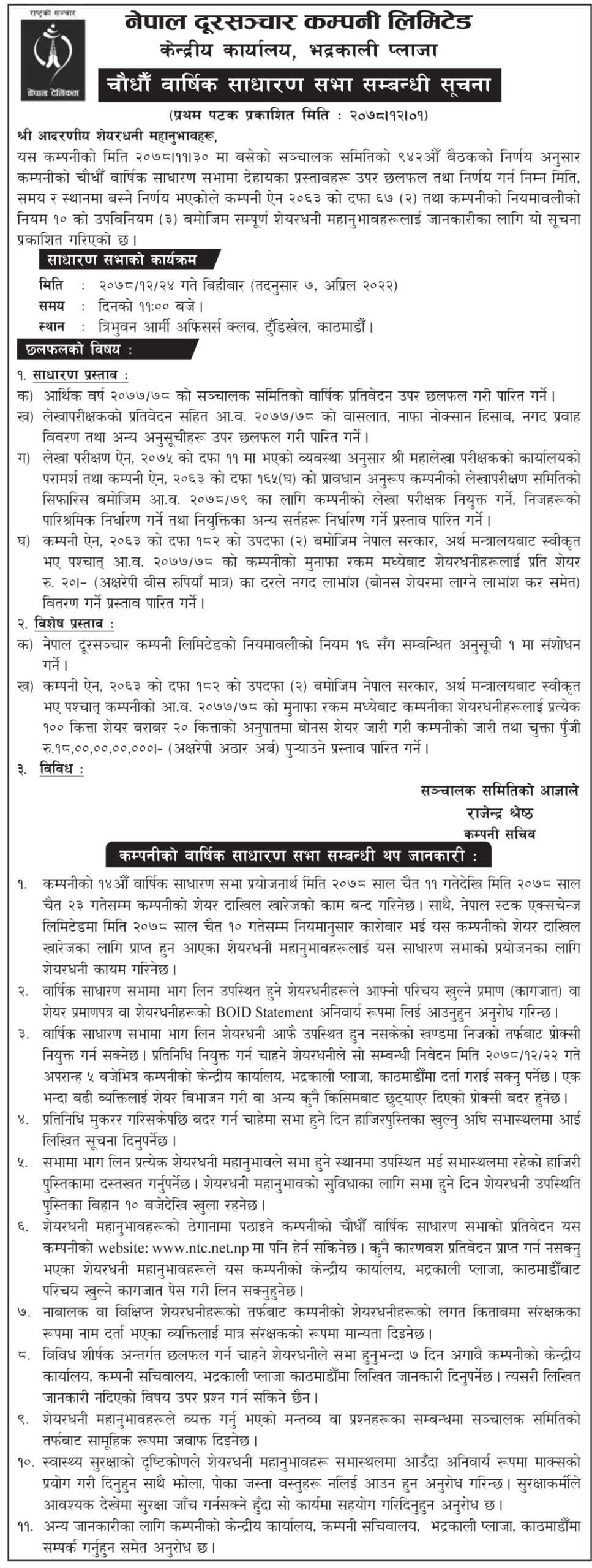 नेपाल टेलिकमको ४० प्रतिशत लाभांश दिने निर्णय, चैत २४ मा डाक्यो साधारण सभा
