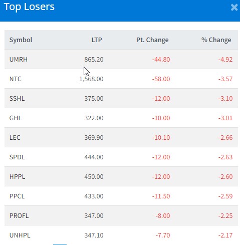 त्यस्तै, नेपाल दुरसञ्चार कम्पनीको ३.५७ प्रतिशत, शिव श्री हाइड्रोपावरको ३.१० प्रतिशत, घलेम्दी हाईड्रोको ३.०१ प्रतिशत र लिबेट्री इर्नजि कम्पनीको २.६६ प्रतिशतले घटेको हो ।