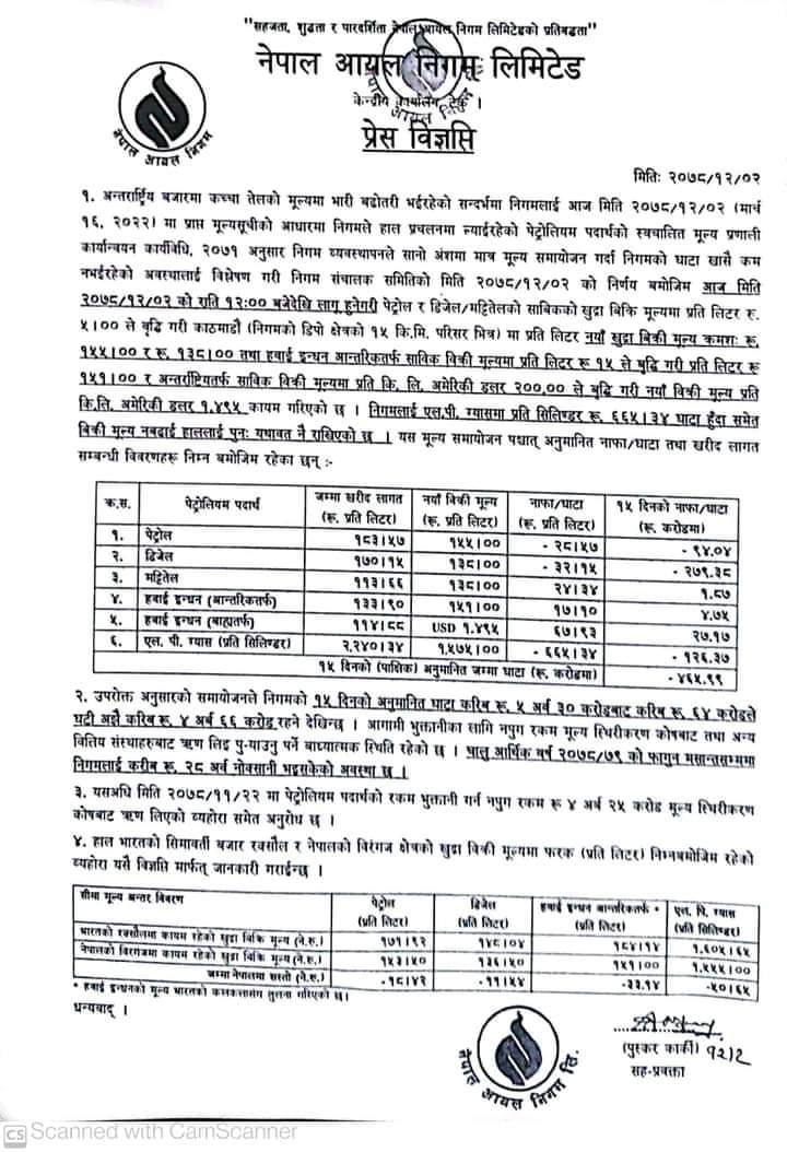 निगमले अन्तर्राष्ट्रिय बजारमा पेट्रोलियम पदार्थको मूल्य बढेर आएकाले नेपालमा पनि बढाएको जनाएको छ ।