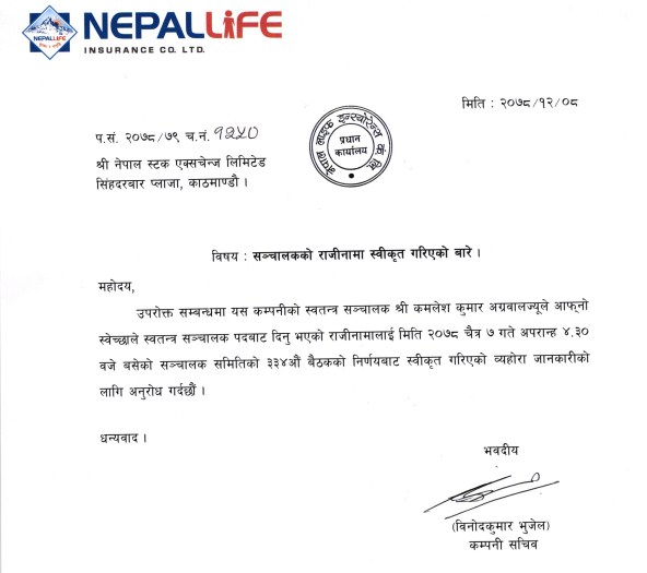 नेपाल लाइफ इन्स्योरेन्सका स्वतन्त्र संचालक कमलेश कुमार अग्रवालले दिए राजिनामा