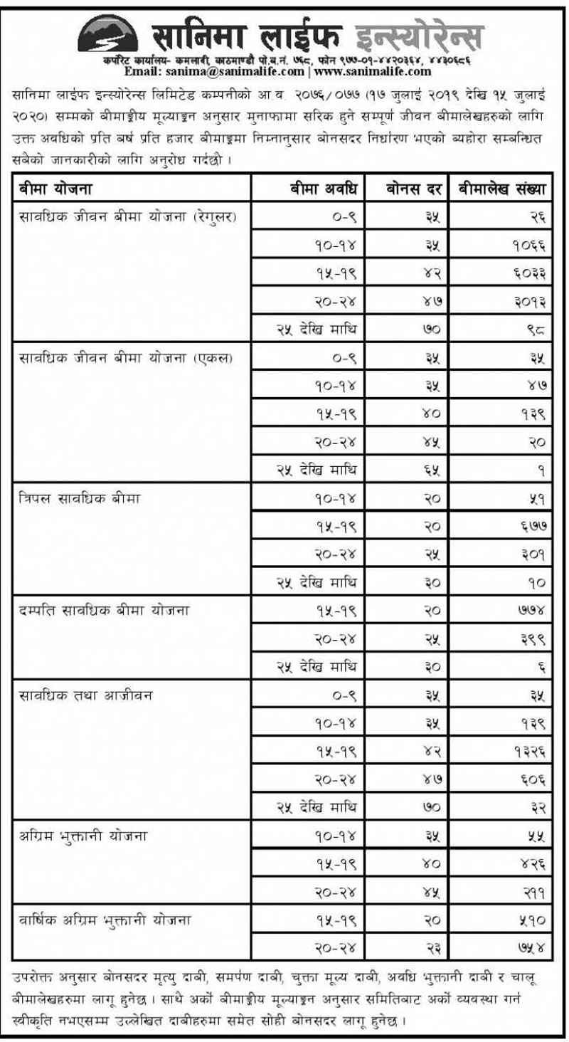 सानिमा लाइफ इन्स्योरेन्सले सावधिक जीवन बीमा योजना (रेगुलर) अन्तर्गतका बीमितलाई न्यूनतम ३५ रुपैयाँदेखि अधिकतम ७० रुपैयाँसम्म बोनसदर उपलब्ध गराउने भएको हो । जसमा ९ वर्षसम्मका लागि ३५ रुपैयाँ, १० देखि १४ वर्षसम्मका लागि ३५ रुपैयाँ, १५ वर्षदेखि १९ वर्षसम्मका लागि ४२ रुपैयाँ, २० वर्षदेखि २४ वर्षसम्मका लागि ४७ रुपैयाँ र २५ वर्षभन्दा माथि प्रतिहजार ७० रुपैयाँ बोनसदर तोकिएको छ ।